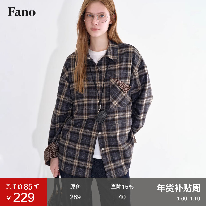 范洛Fano 休闲百搭复古格纹质感金属五爪扣磨毛衬衫女上衣2025冬