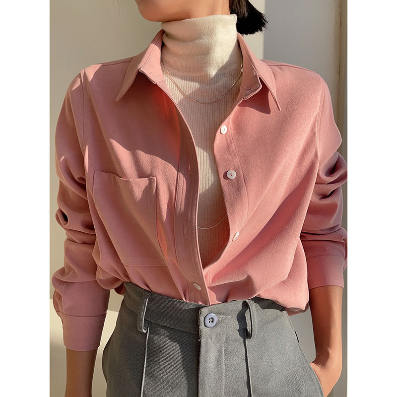 复古港风小众磨毛衬衫女长袖春秋冬新款宽松简约打底衬衣开衫上衣