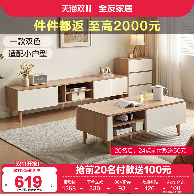 政府补贴全友家居北欧原木风茶几电视柜组合奶油风客厅收纳储物柜