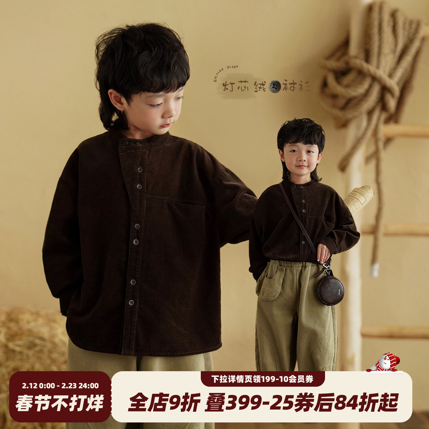 砚台家儿童纯棉灯芯绒衬衣秋冬装男童深棕色衬衫宝宝复古文艺上衣