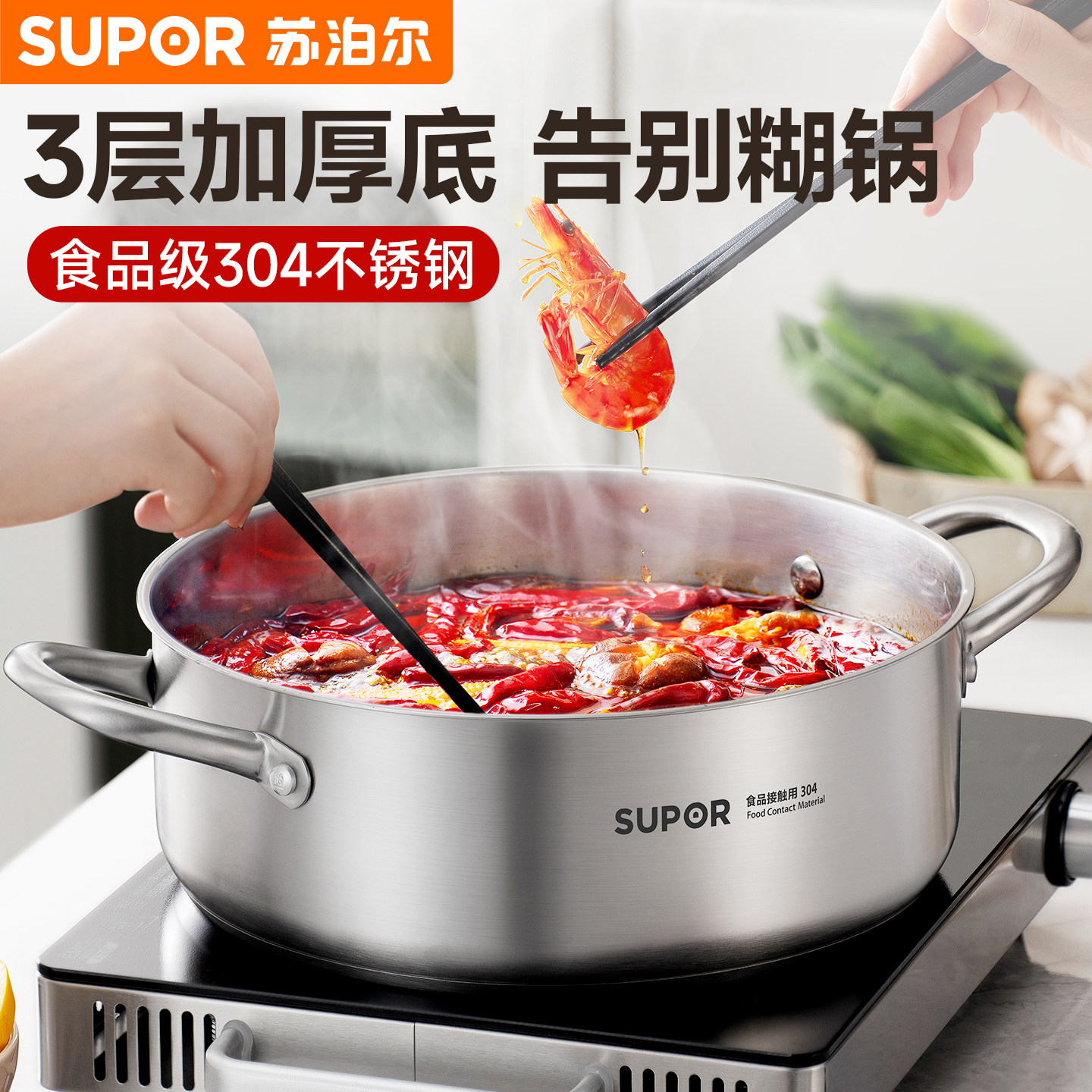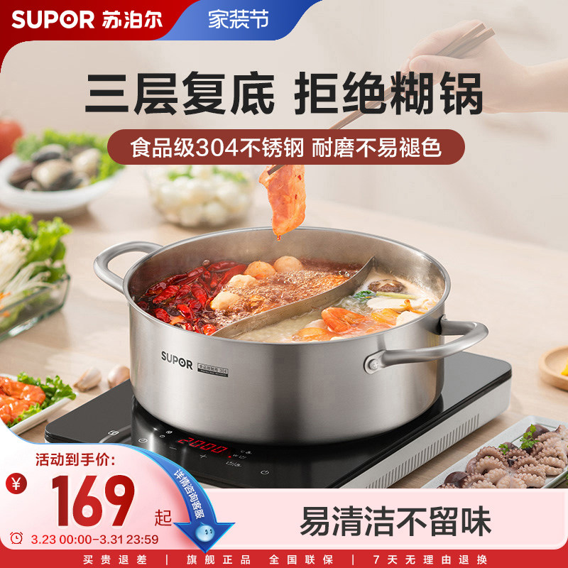 苏泊尔清汤锅/鸳鸯火锅锅具家用304不锈钢电磁炉专用涮煮锅火锅盆