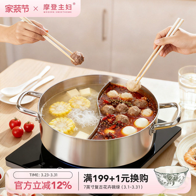 摩登主妇304不锈钢鸳鸯锅火锅专用盆家用汤锅加厚清汤电磁炉锅具