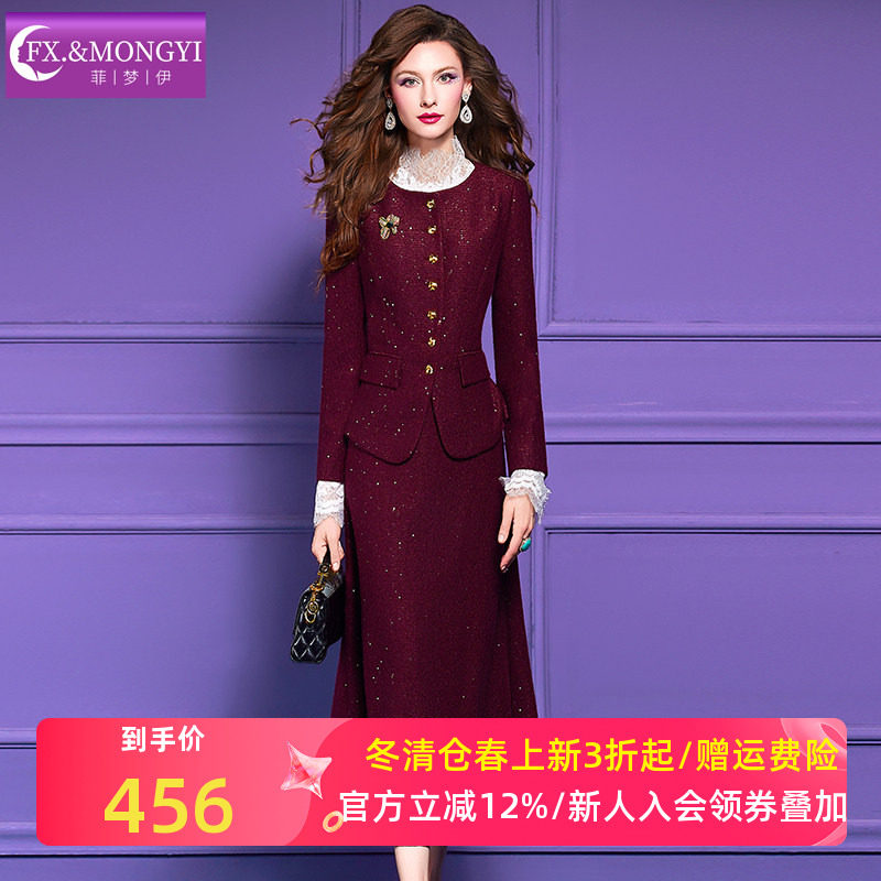 菲梦伊含羊毛亮片红色毛呢套装女秋冬新款复古名媛小香风外套半裙