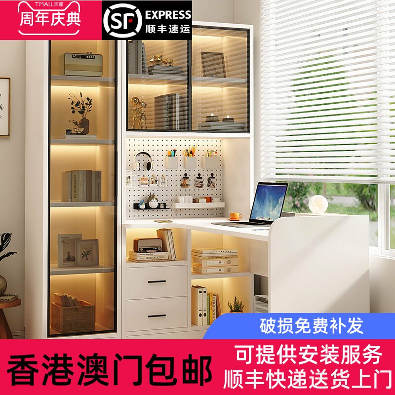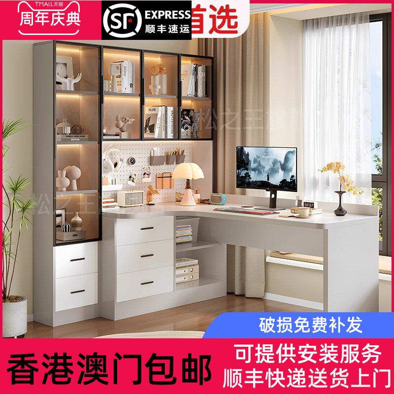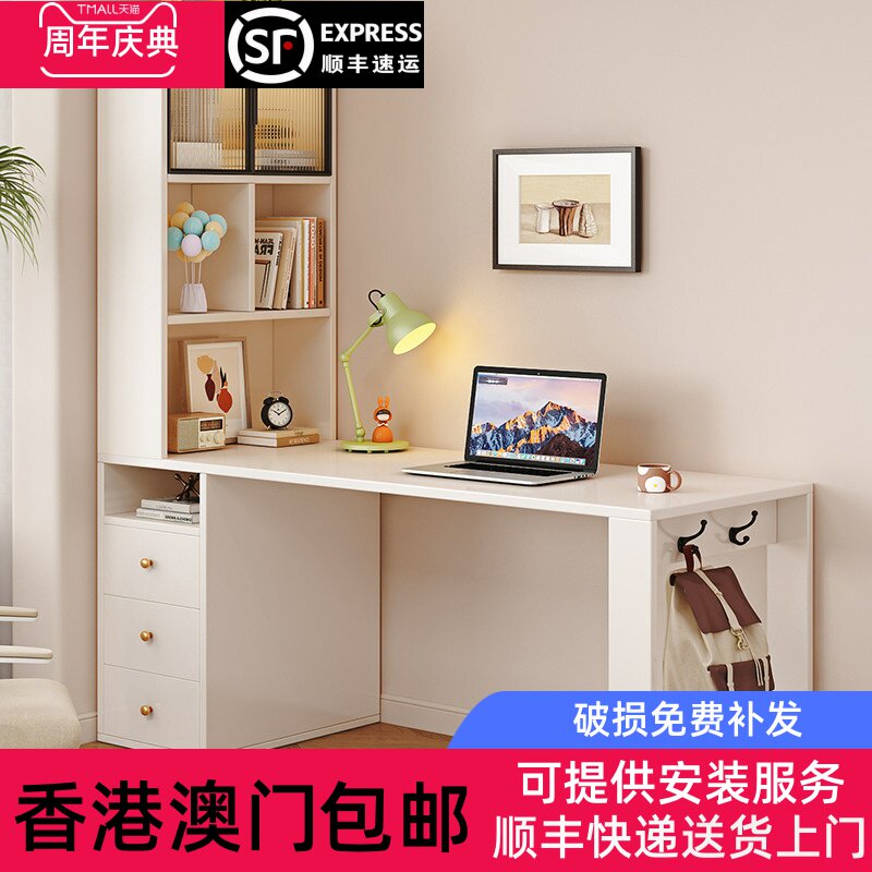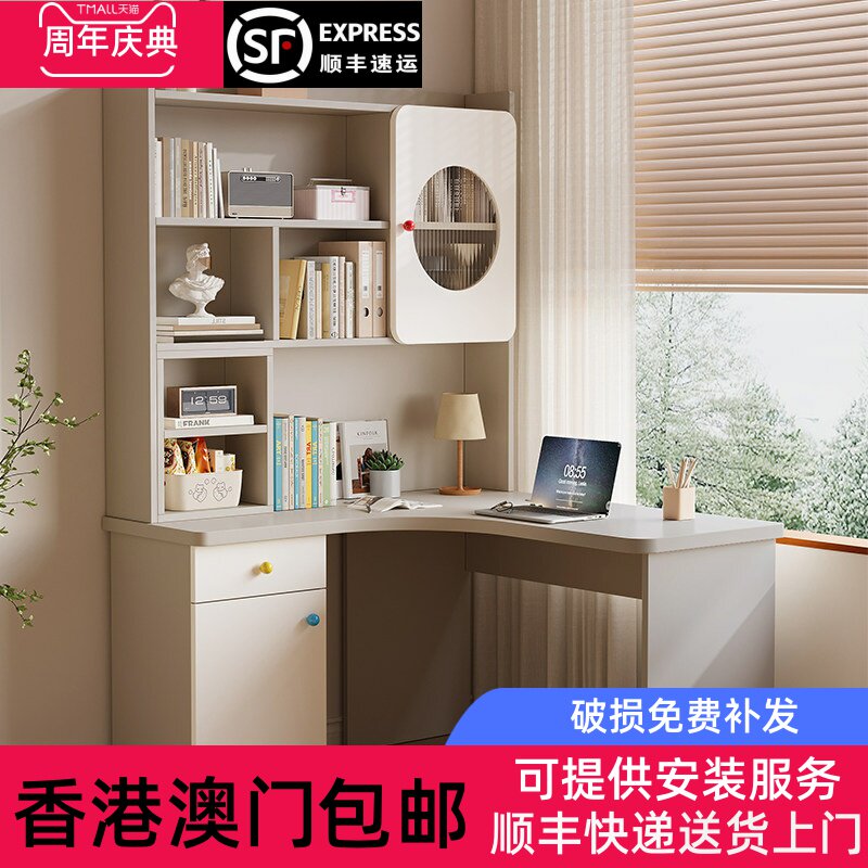 [香港包邮]实木书桌书架一体转角奶油风电脑桌收纳柜学生家用学习
