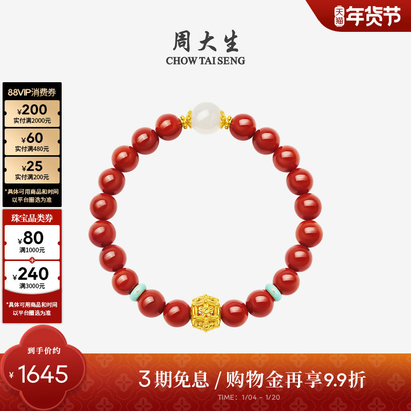 周大生黄金手链和田玉手串足金转运珠骐骥红玛瑙喜柿连连新年礼物