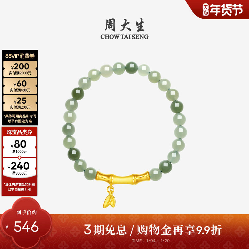 周大生和田玉手串黄金竹节两世欢铃兰手链新年礼物送女朋友送妈妈