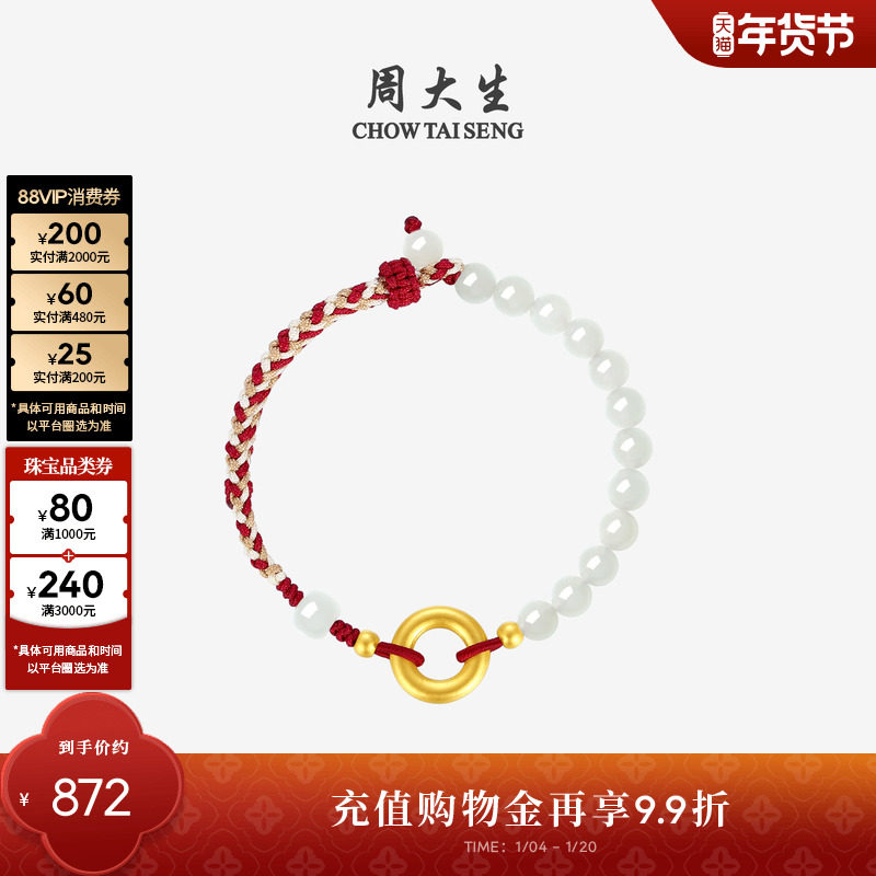 周大生黄金镶玉足金和田玉莲花本命年红绳手链编织新年礼物送女友
