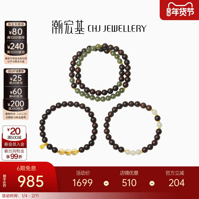 潮宏基倾玉足金小叶紫檀和田玉手串黄晶黄金一款两戴女新中式文玩