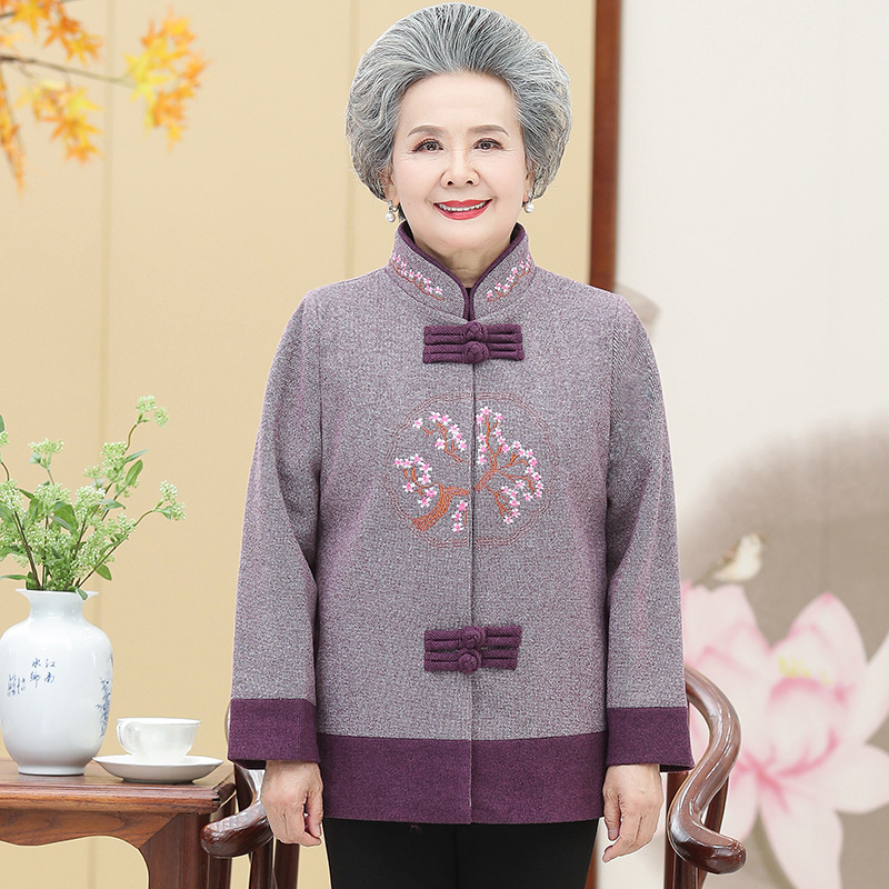 奶奶装春装毛呢上衣中老年人女妈妈装唐装老太太春秋立领盘扣外套