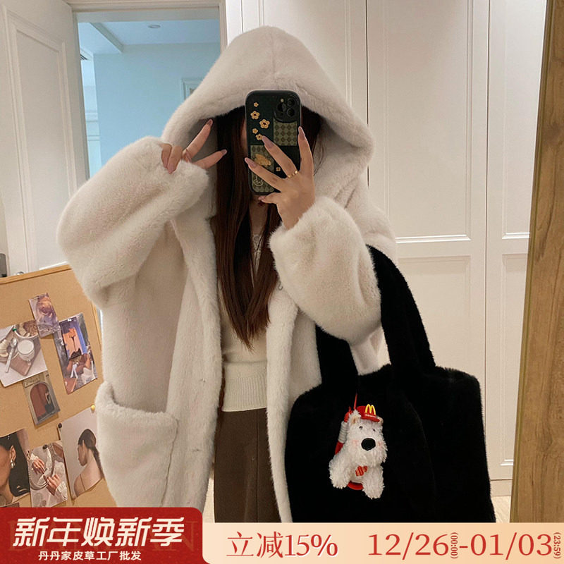水貂绒环保皮草貂皮大衣皮毛一体宽松慵懒连帽中长款毛毛外套女冬