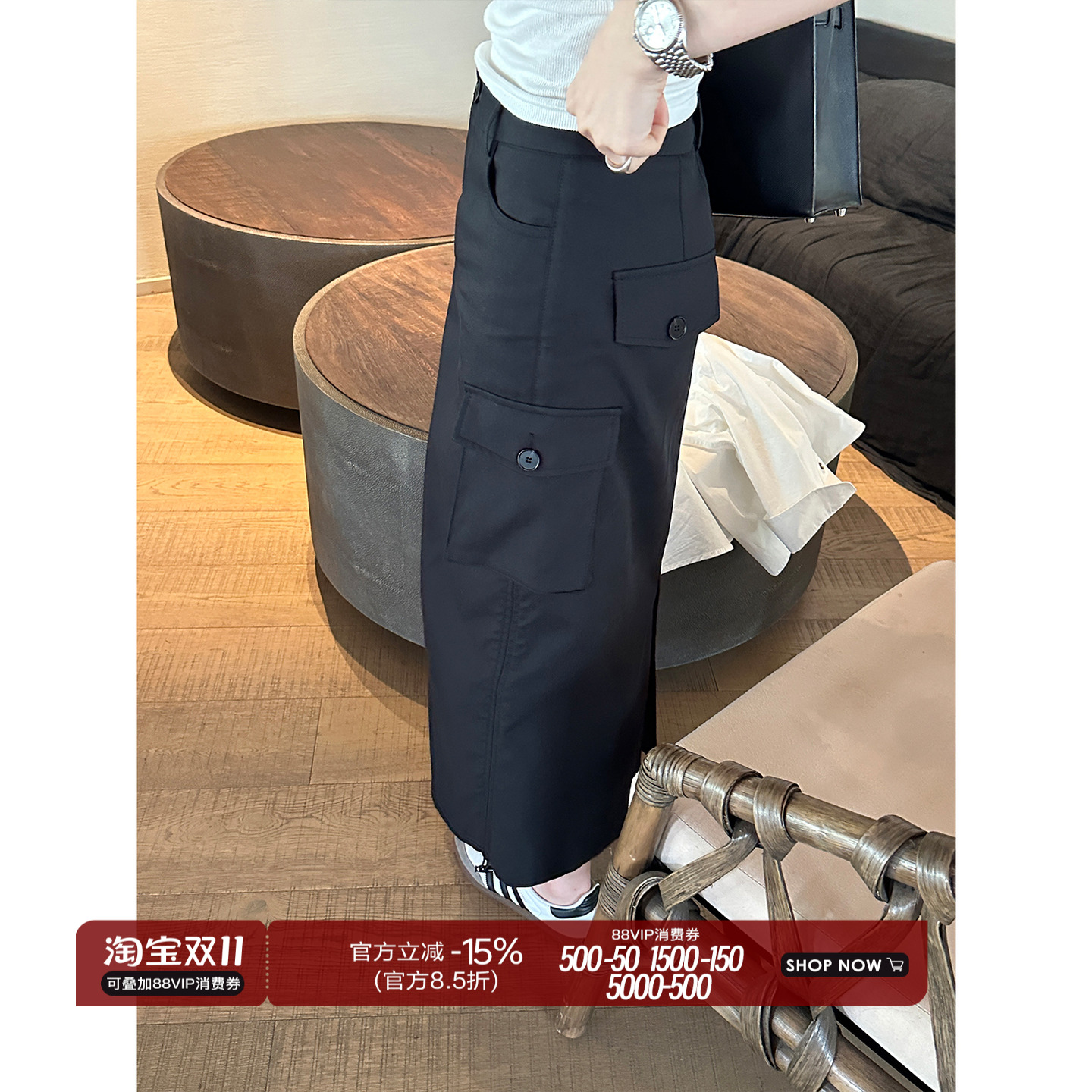 YANGLE_黑色半身裙女2025年秋季新款高腰宽松显瘦直筒休闲工装裙