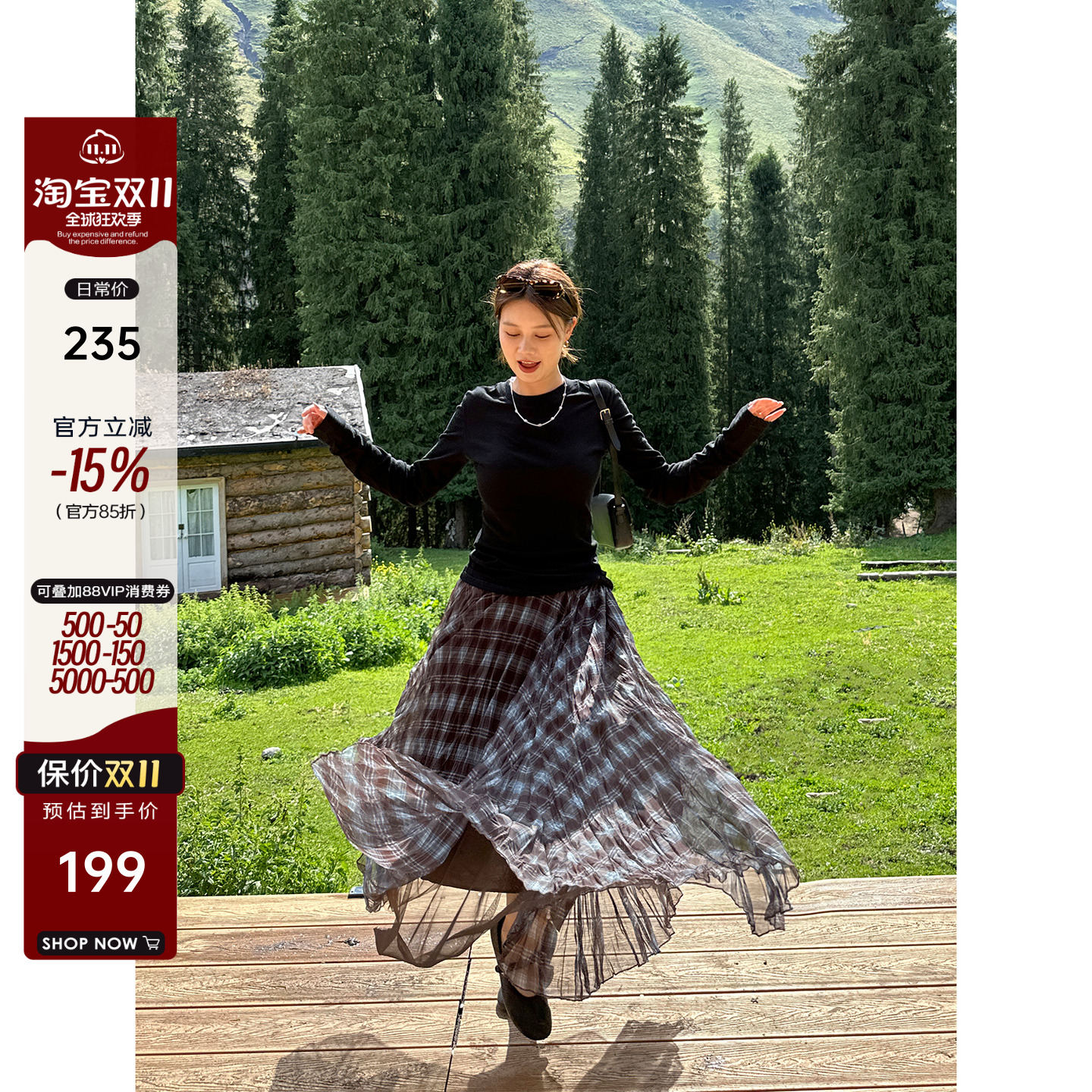 YANGLE_a字半身裙女2025年秋季新款中长款高腰不规则复古格子伞裙