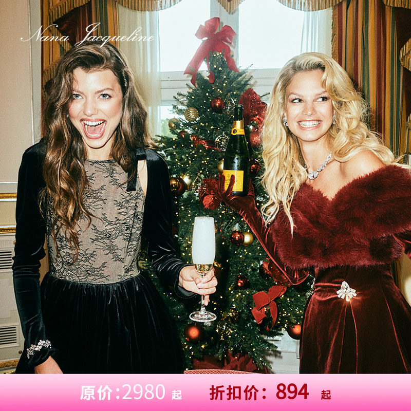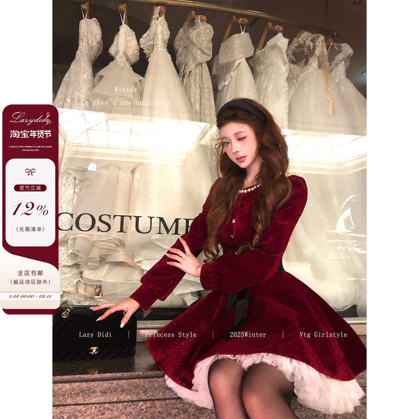 自制"新年战袍"法式设计感千金红色丝绒水钻收腰气质蓬蓬裙连衣裙