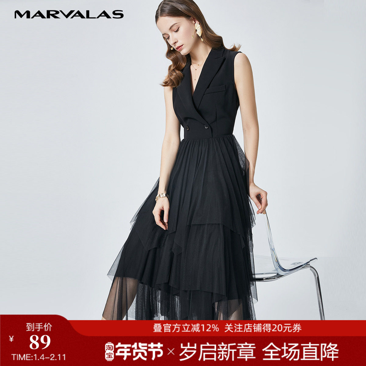 曼德诗黑色西装连衣裙女2025年夏款拼接网纱裙不规则气质蓬蓬裙