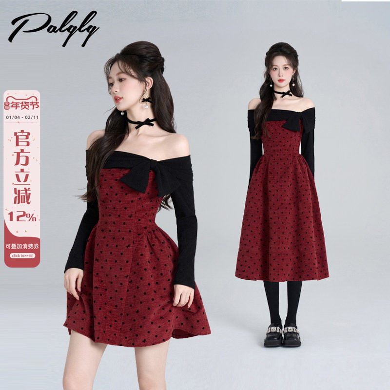 红色一字肩波点收腰蓬蓬连衣裙女秋冬新款小香风氛围感小礼a字裙