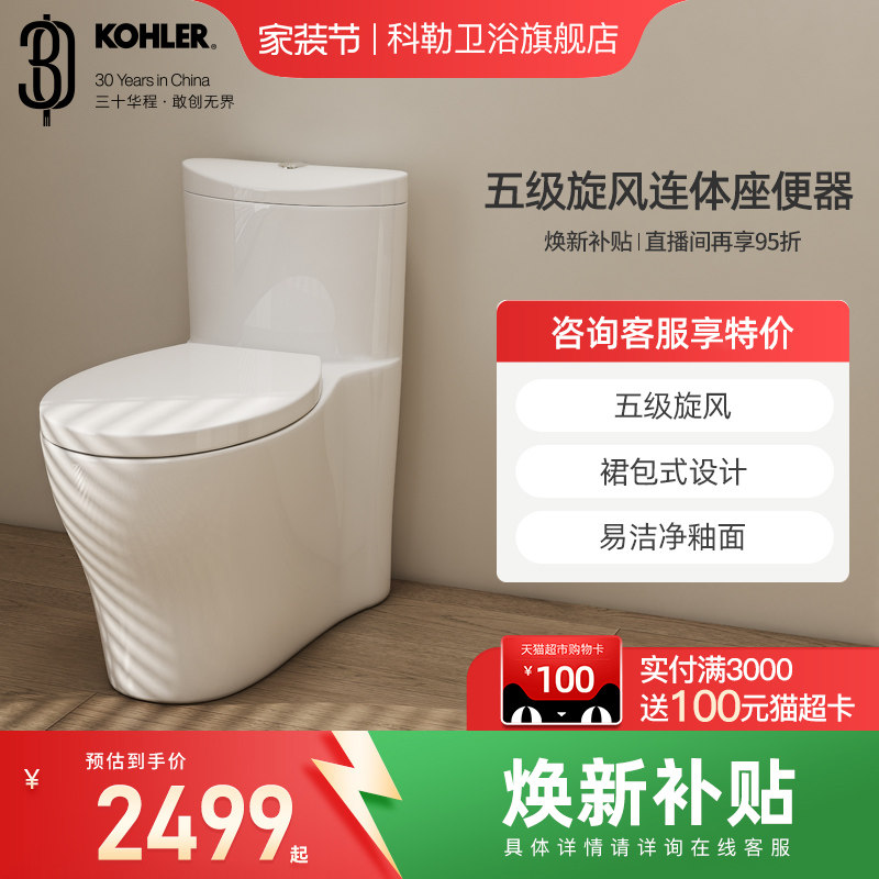 科勒官方马桶坐便器水漾五级旋风静音节水连体家用抽水马桶3869