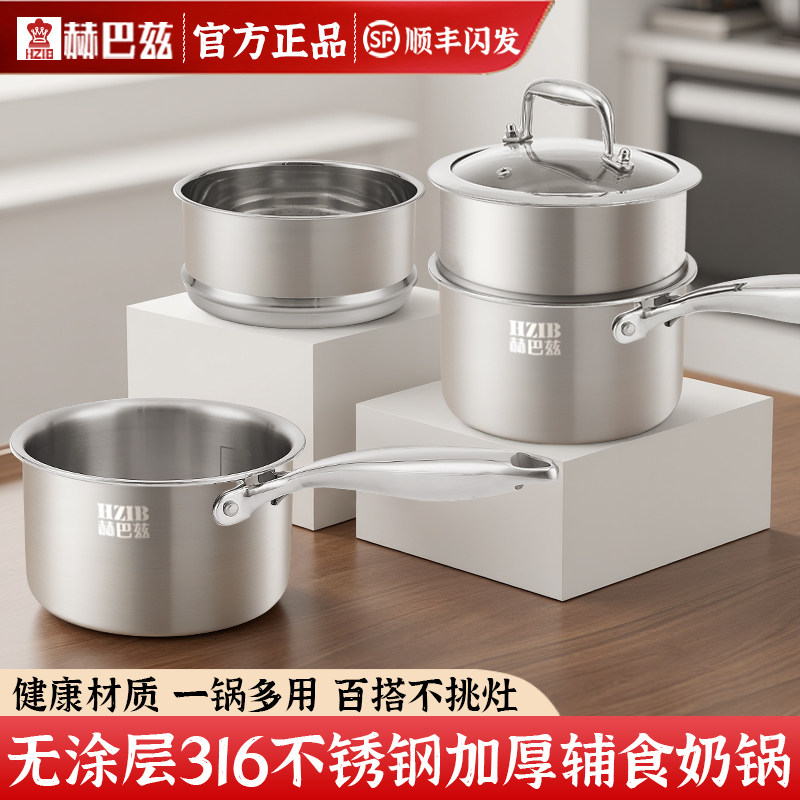 赫巴兹无涂层316不锈钢奶锅宝宝专用辅食锅家用婴儿加厚蒸锅小锅