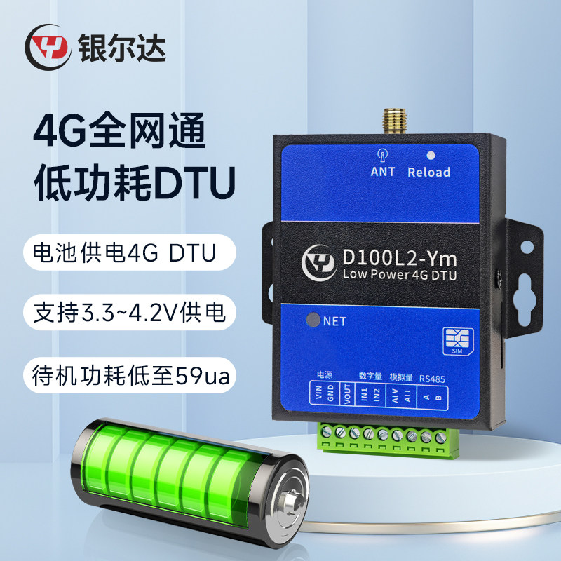 银尔达电池供电低功耗4G DTU模块一路RS485二路模拟量4-20ma输入