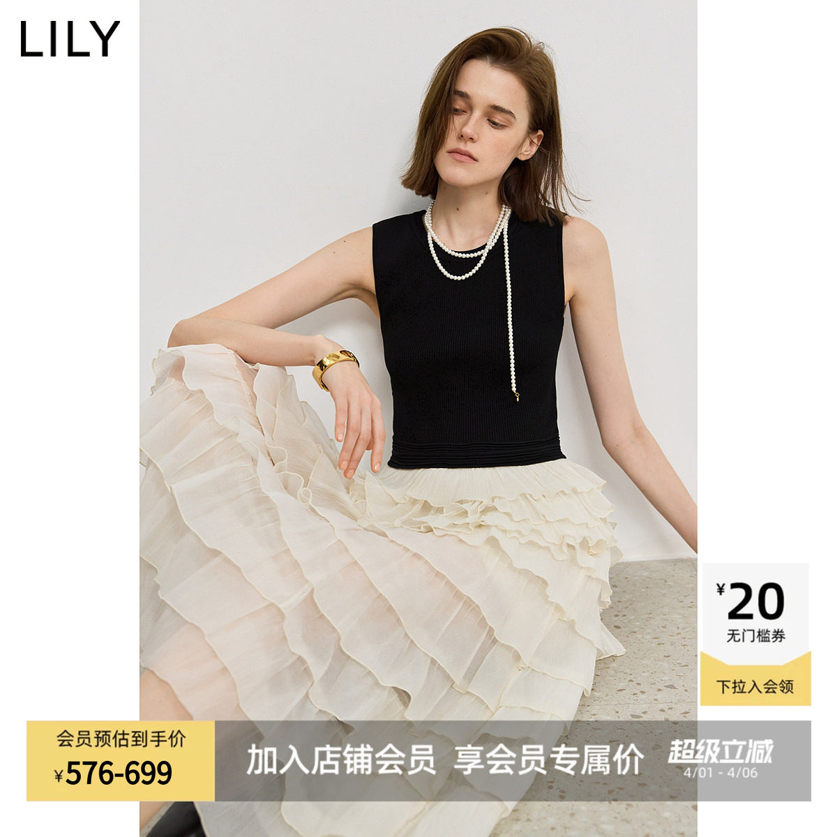 LILY2026冬新款法式醋酸高腰修身网纱连衣裙气质通勤蛋糕长裙女