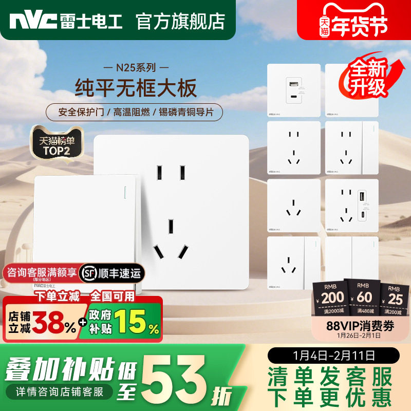 雷士开关插座面板一开五孔免喷涂16A空调暗装奶油风电源插座N25白