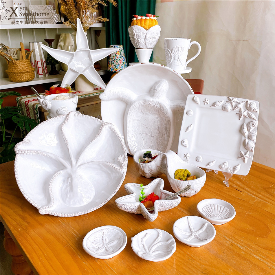 出口红牌复古做旧海洋餐具套装立体浮雕贝壳海星乌龟章鱼分隔盘碗