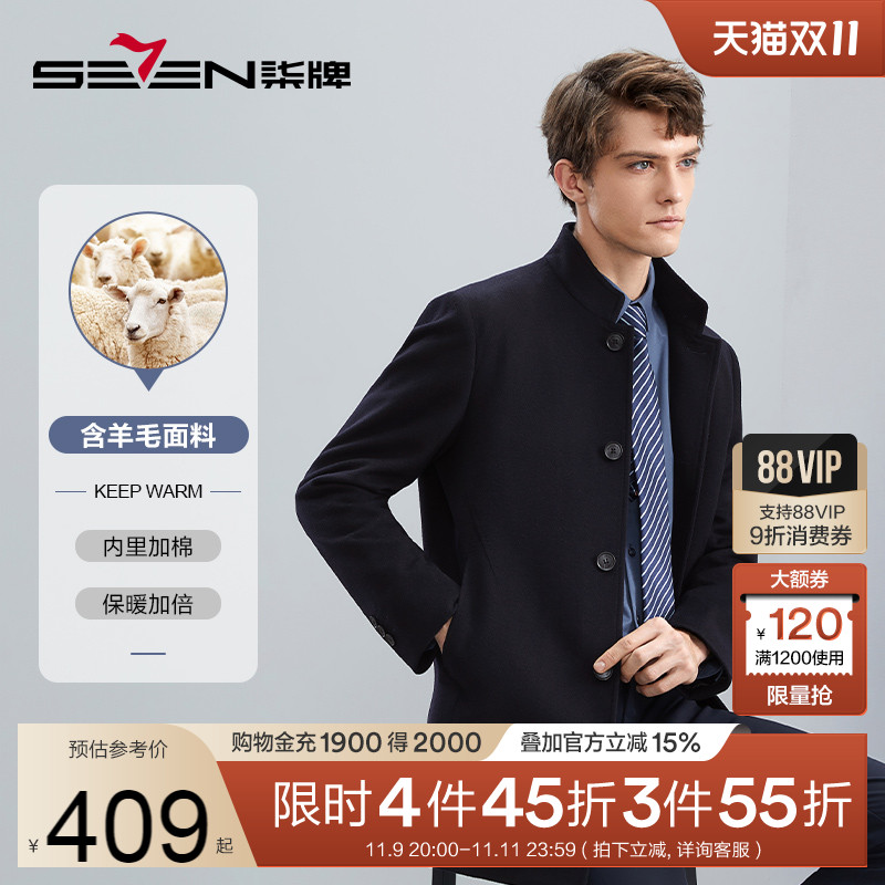 【含羊毛】柒牌男士立领毛呢大衣时尚冬季中长款加棉加厚保暖外套