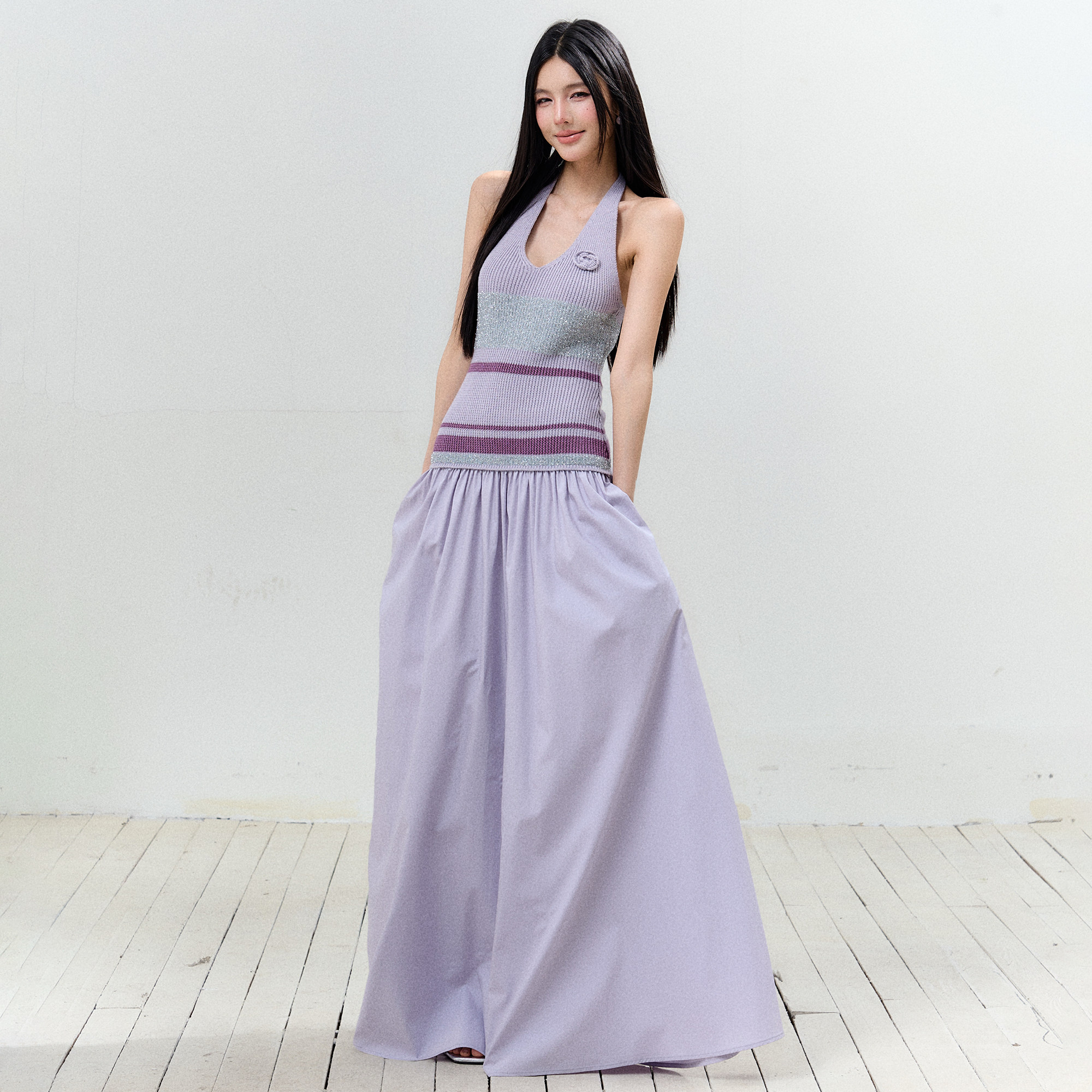 AGAM 浪漫度假风亮丝绑挂脖连衣裙v领梦幻紫清纯露背吊带长裙