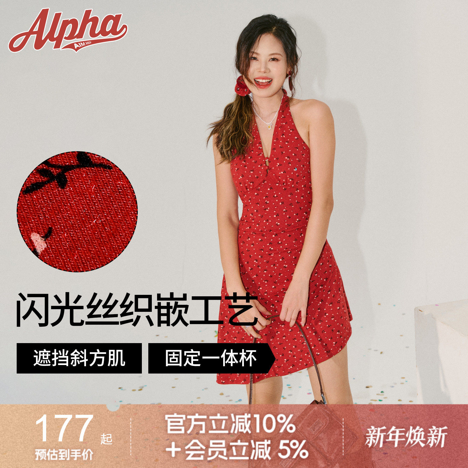 AlphaGym定制亮丝面料带胸垫|复古碎花露背连衣裙修身V领吊带长裙