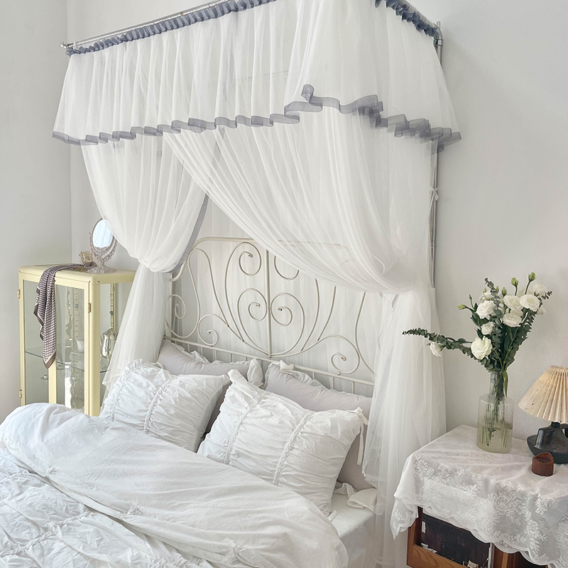 白色U型伸缩蚊帐三开门支架家用卧室公主风床幔加密落地新款高级
