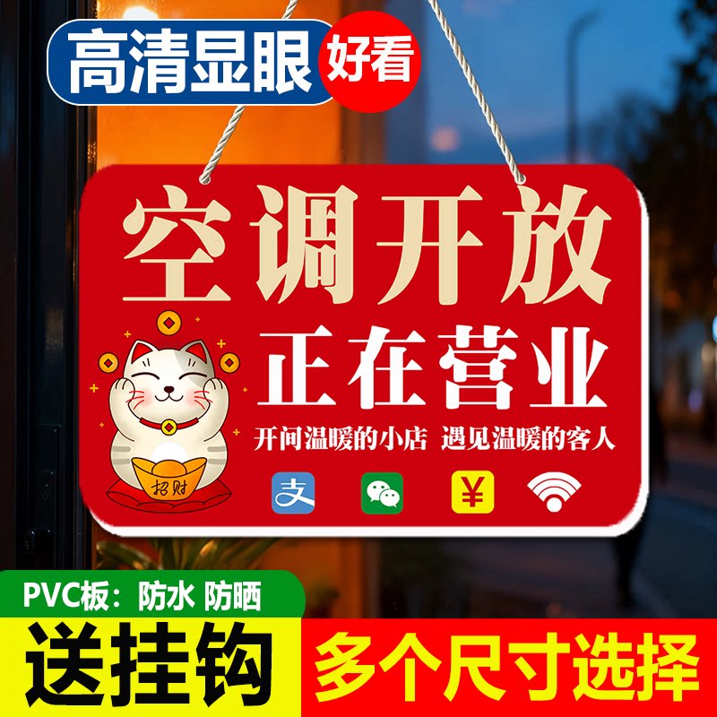 营业中空调开放挂牌正在营业空调开放提示牌店主外出有事出去一会马上回来告示牌欢迎光临随手关门提示牌贴纸