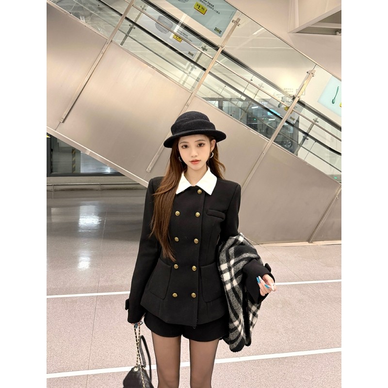 韩系千金感学院风黑色套装毛呢双排扣修身显瘦外套直筒短裤两件套