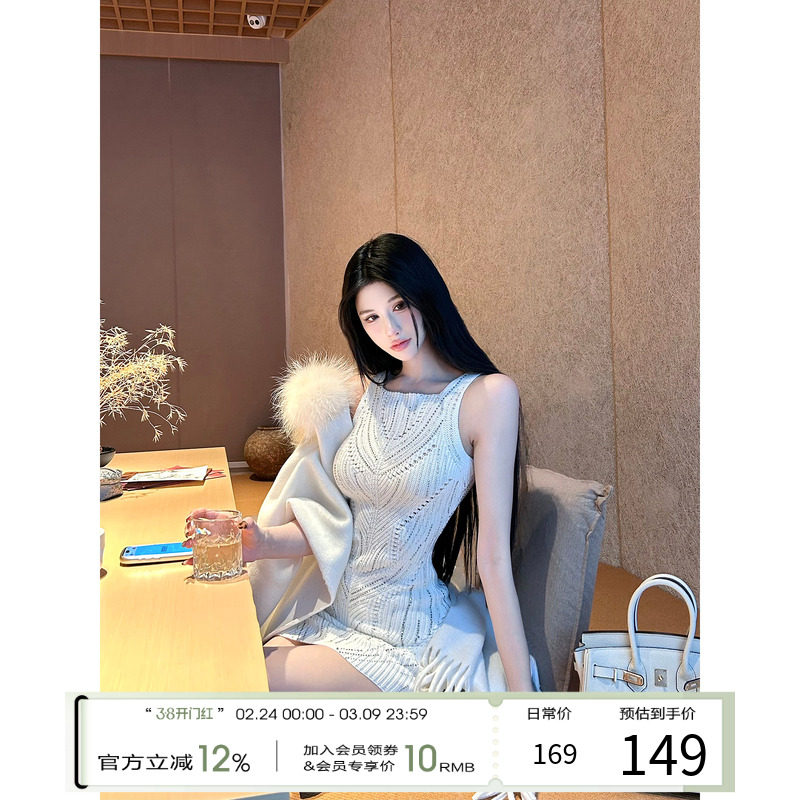 灰尘邓邓 针织挂脖连衣裙2025秋冬新款性感包臀裙法式白色裙子