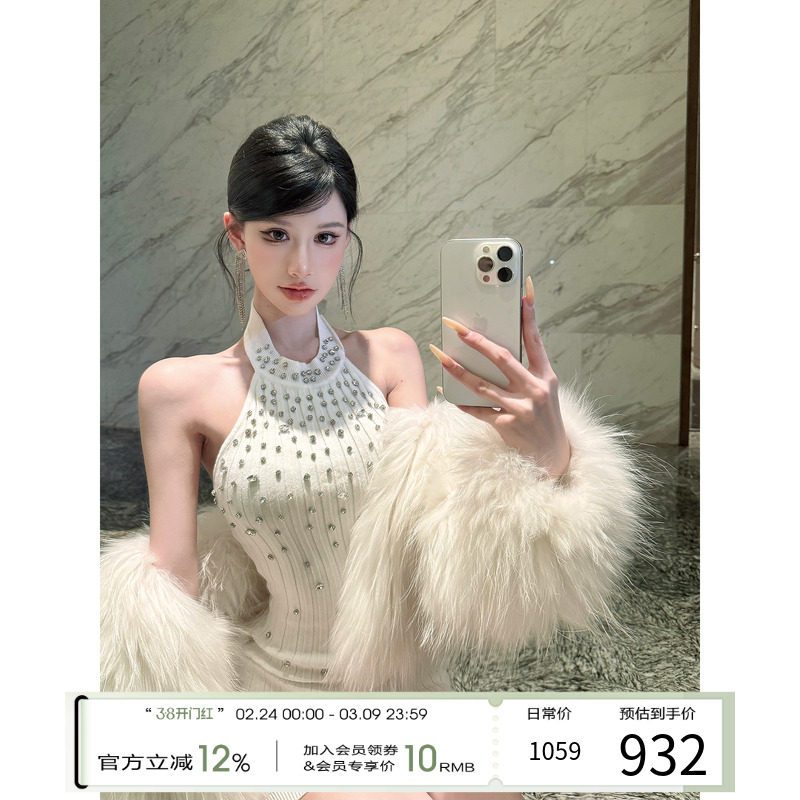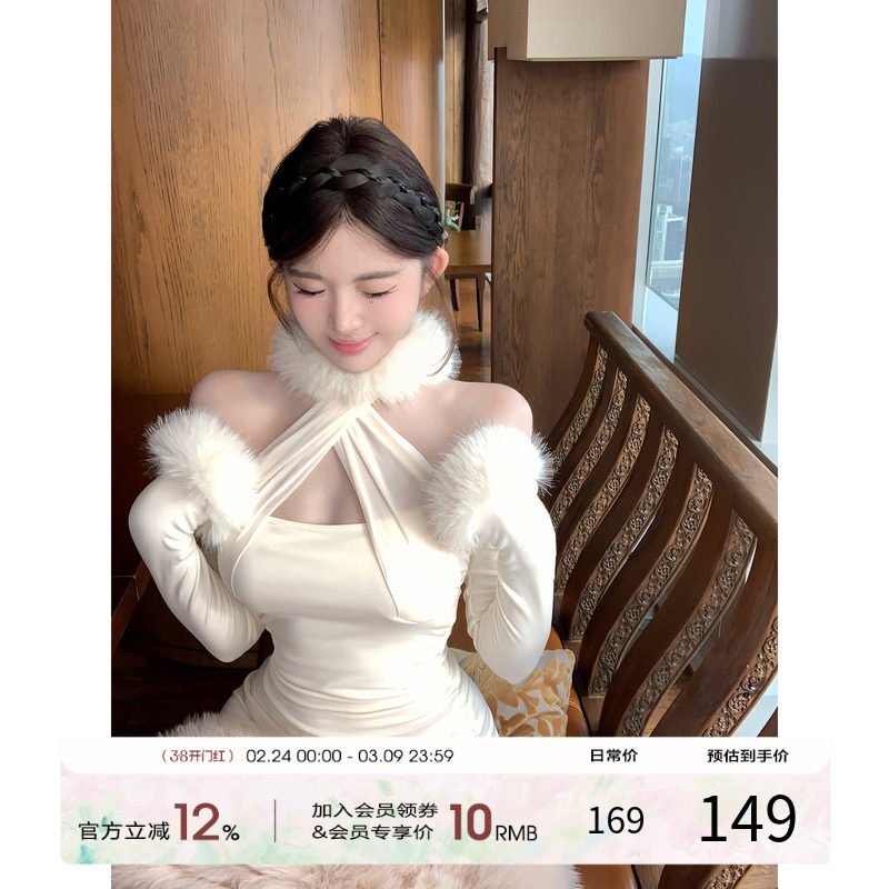 项天鹅er 挂脖针织连衣裙女2025冬季新款毛领拼接包臀裙纯欲裙子
