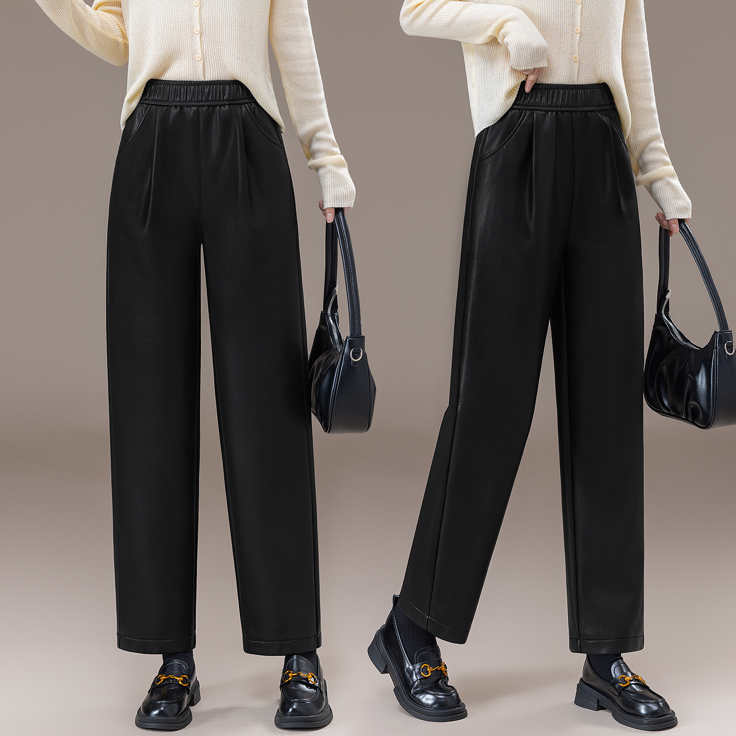 2025年秋冬新款女皮裤宽松直筒长裤妈妈裤高腰大码加绒加厚中老年