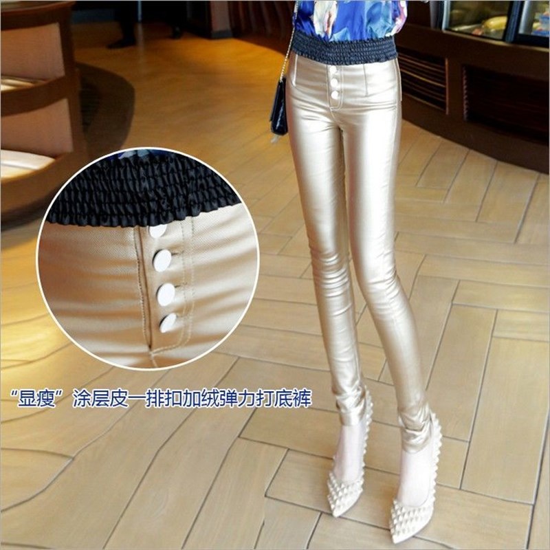 PU加绒皮裤女加厚秋冬大码显瘦紧身高腰小脚裤金色涂层外穿打底裤