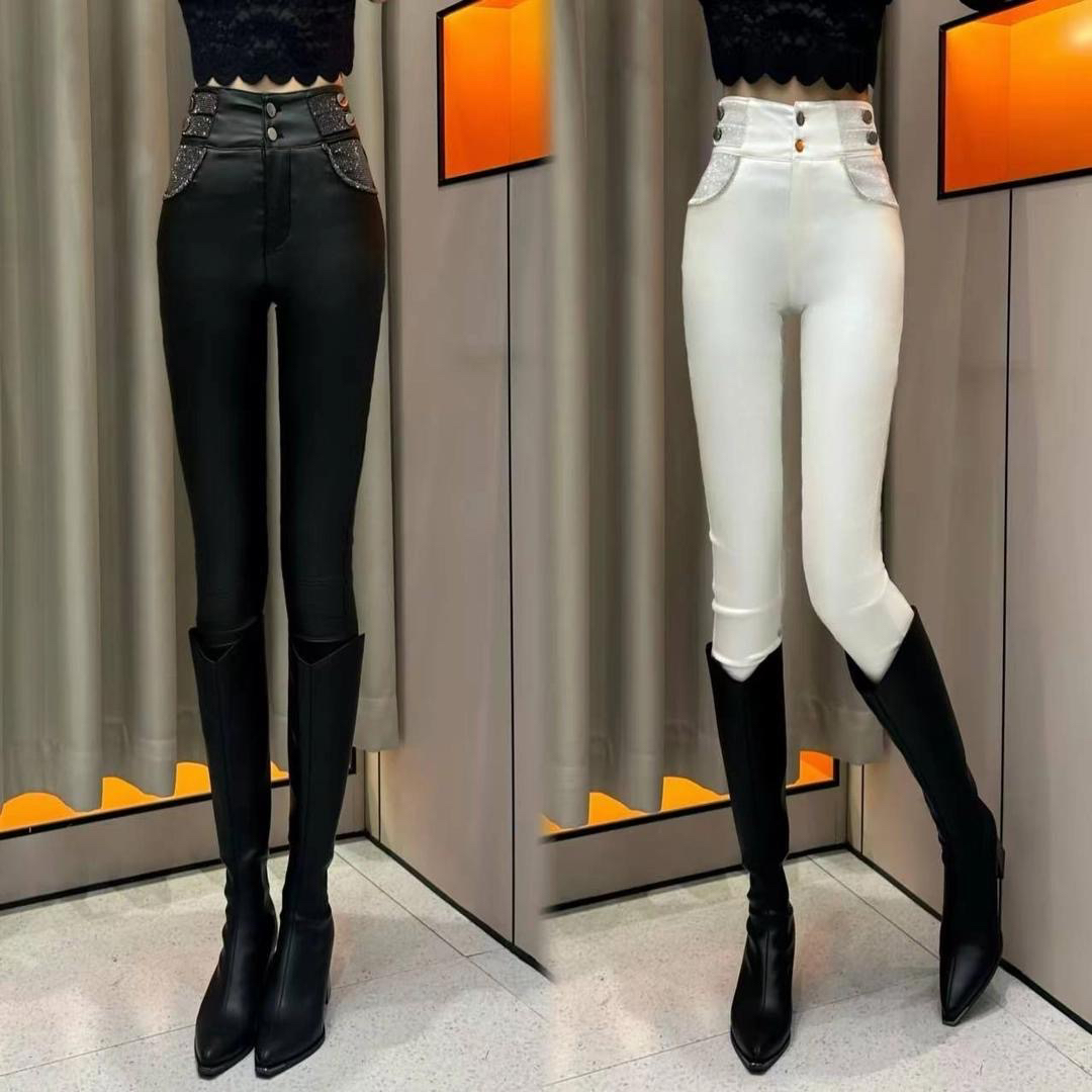 加绒皮裤女2024新款高腰加厚秋冬外穿无痕薄款打底紧身长裤子女冬