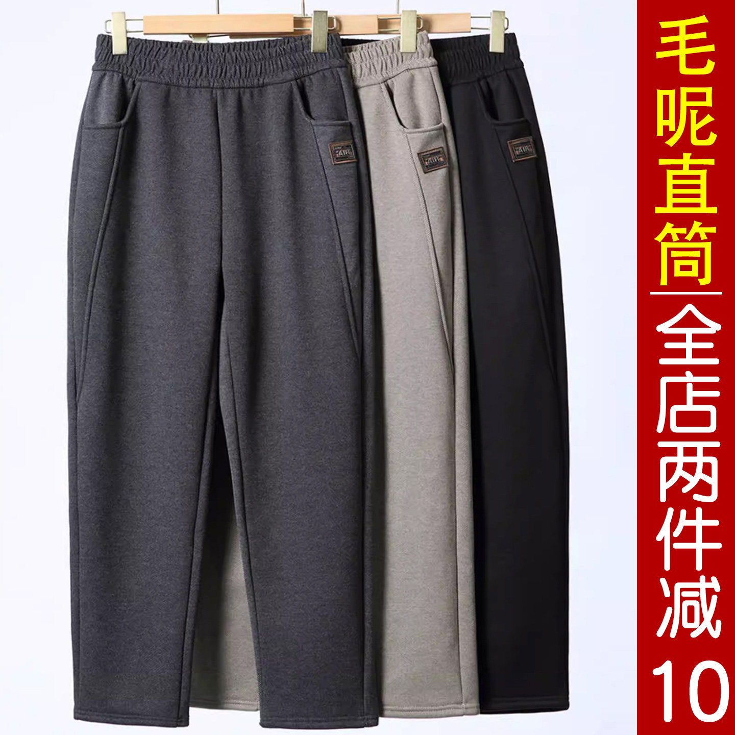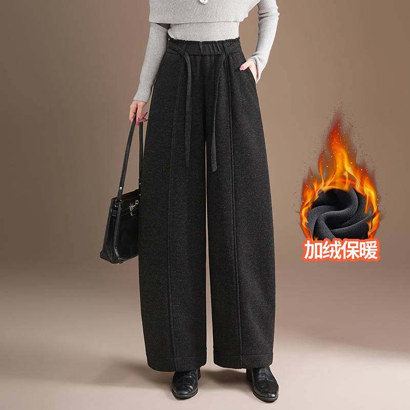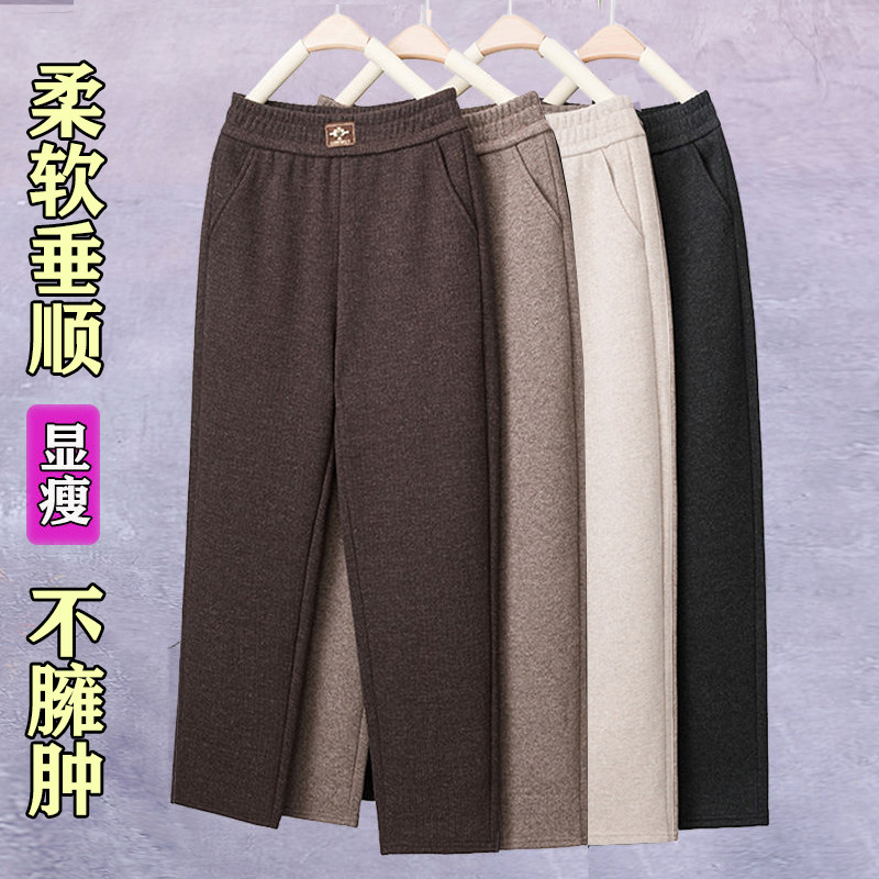 2025秋冬新女裤妈妈直筒毛呢休闲长裤高腰松紧加绒加厚中老年阔腿