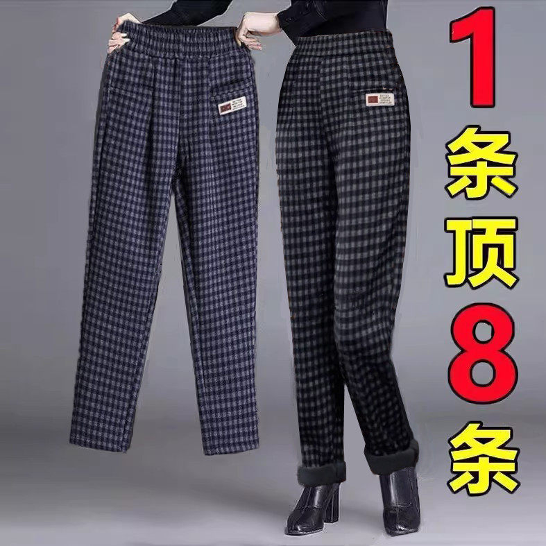 毛呢女裤子秋冬高腰中老年妈妈裤加绒加厚格子休闲裤宽松直筒长裤