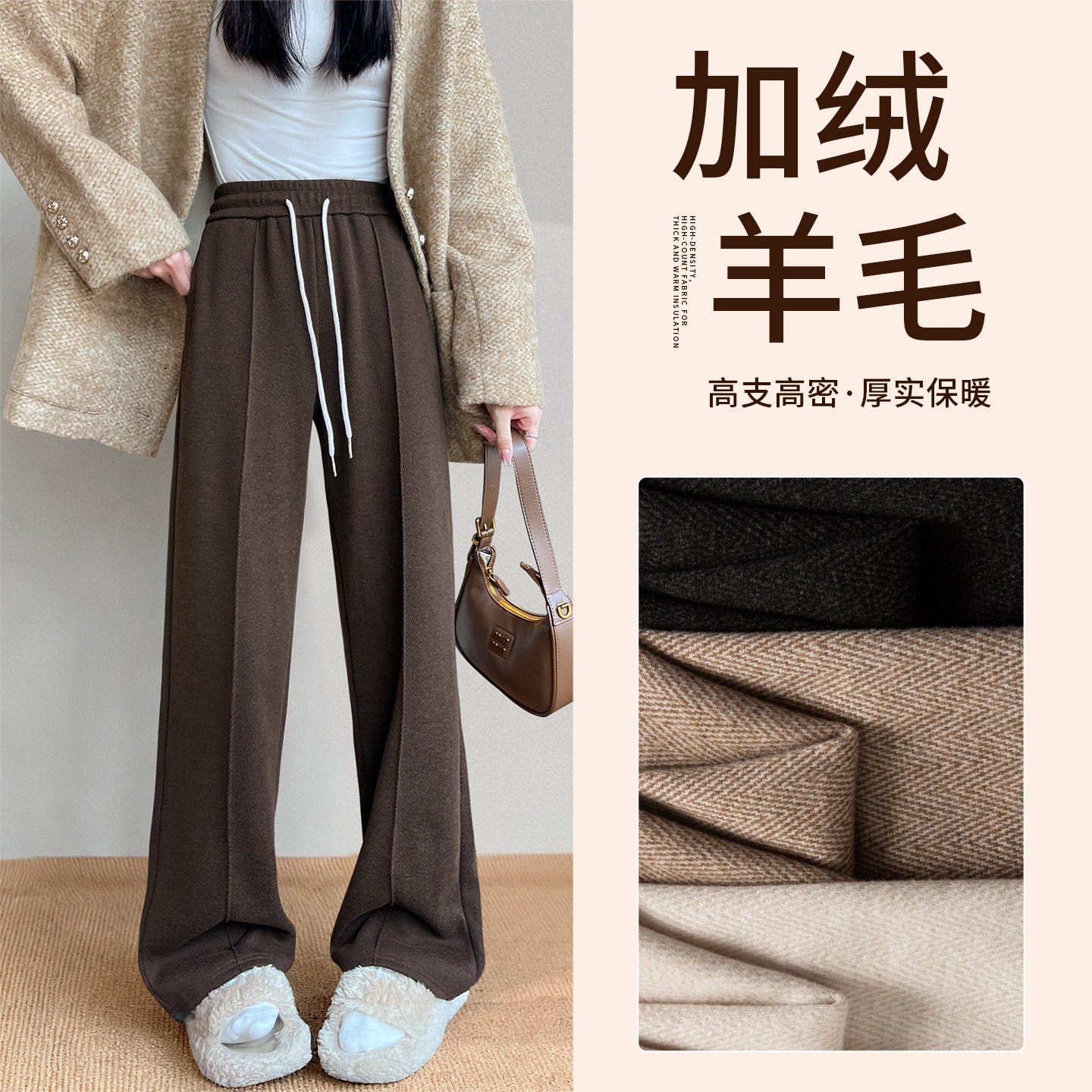 毛呢阔腿裤女裤春秋冬宽松高腰直筒加绒休闲裤子百搭显瘦拖地长裤