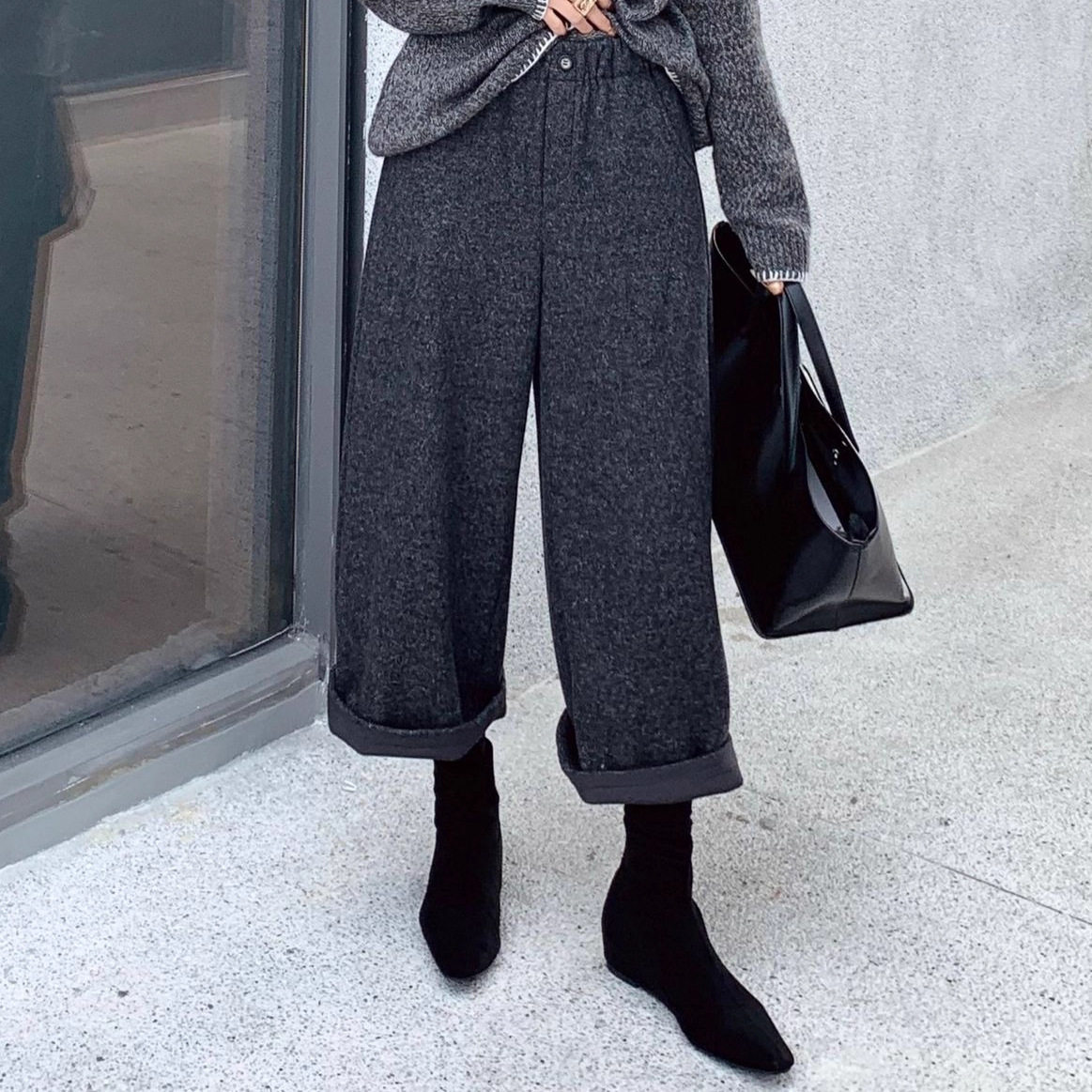 妖猪加绒加厚松紧腰宽松百搭休闲九分裤冬季新款深灰色羊毛呢女裤