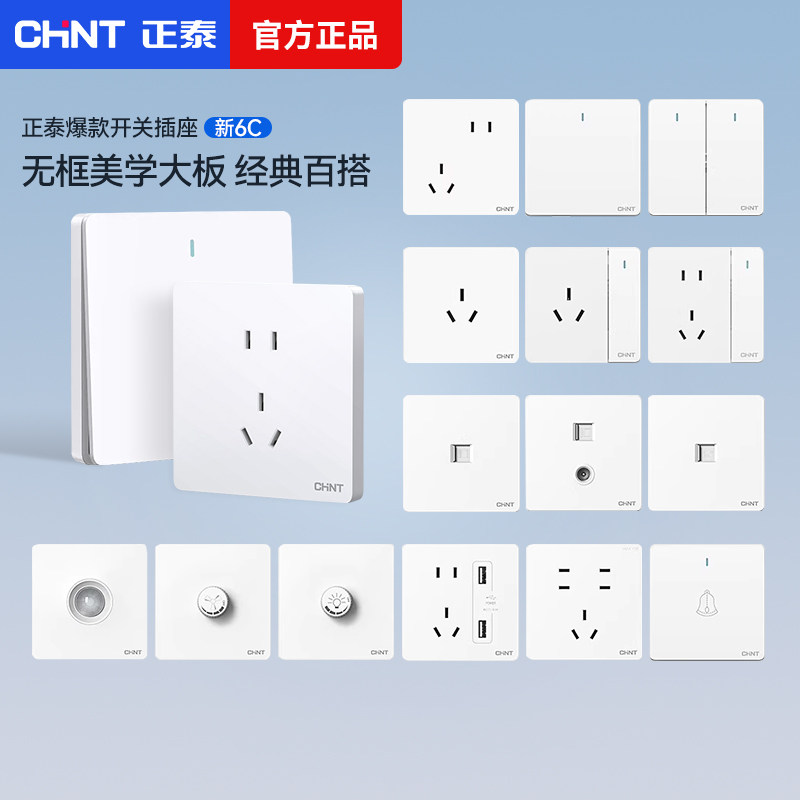 正泰6C白色开关插座面板多孔一开五5孔家用86型暗装chint墙壁插座