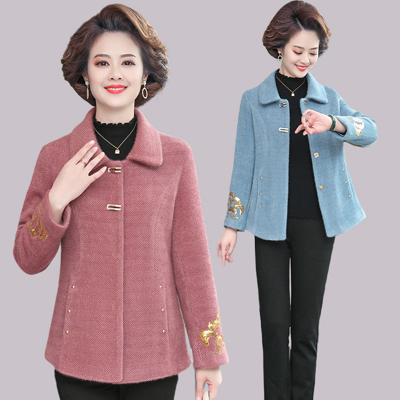 小个子妈妈秋装羊毛呢外套女短款洋气中老年人秋冬水貂绒夹克上衣
