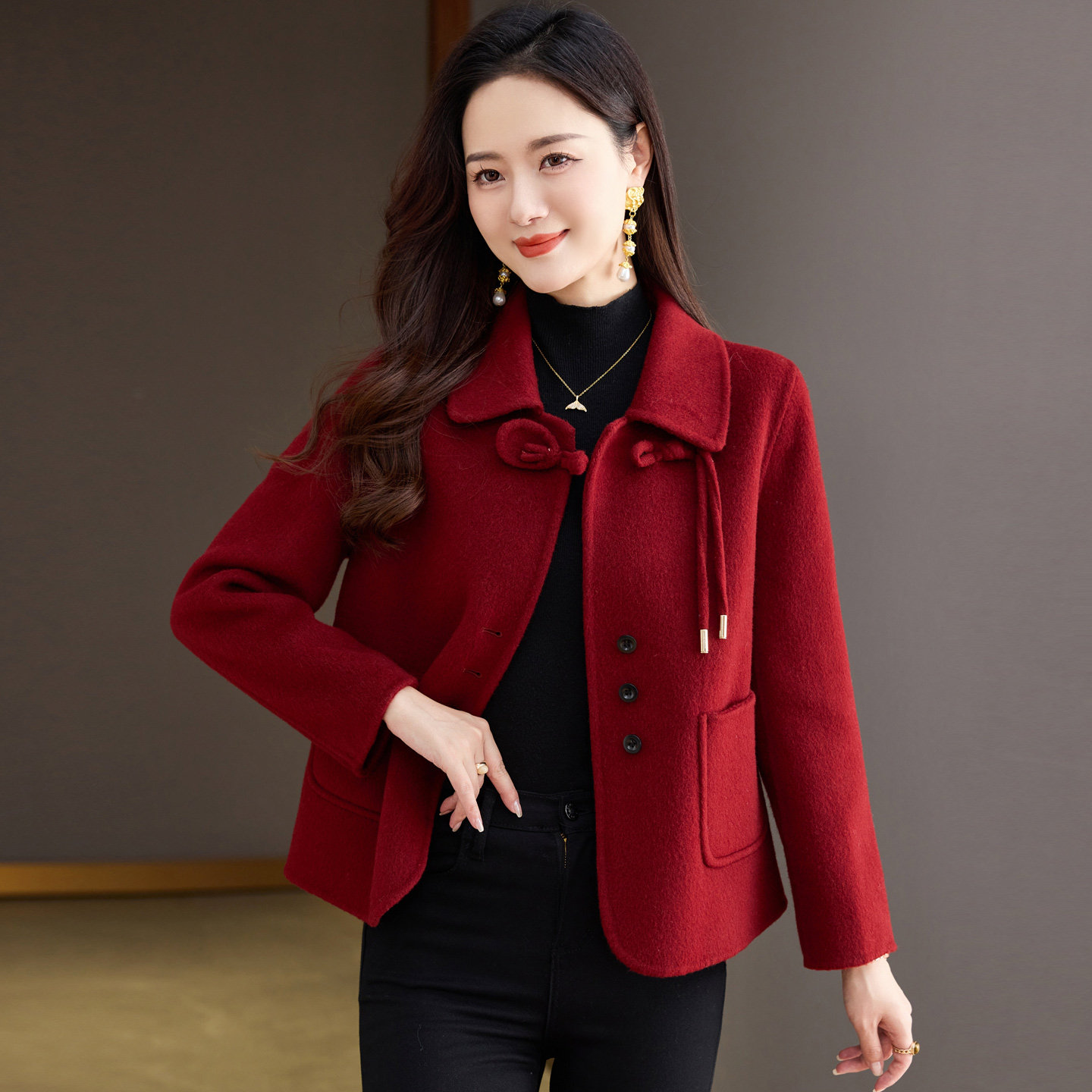 妈妈装2025新款红色国风盘扣毛呢外套女秋冬短款双面呢羊毛大衣