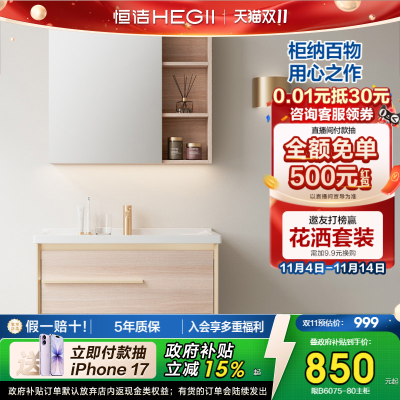 恒洁卫浴现代简约浴室柜小户型卫生间洗脸洗手盆柜组合陶瓷一体盆