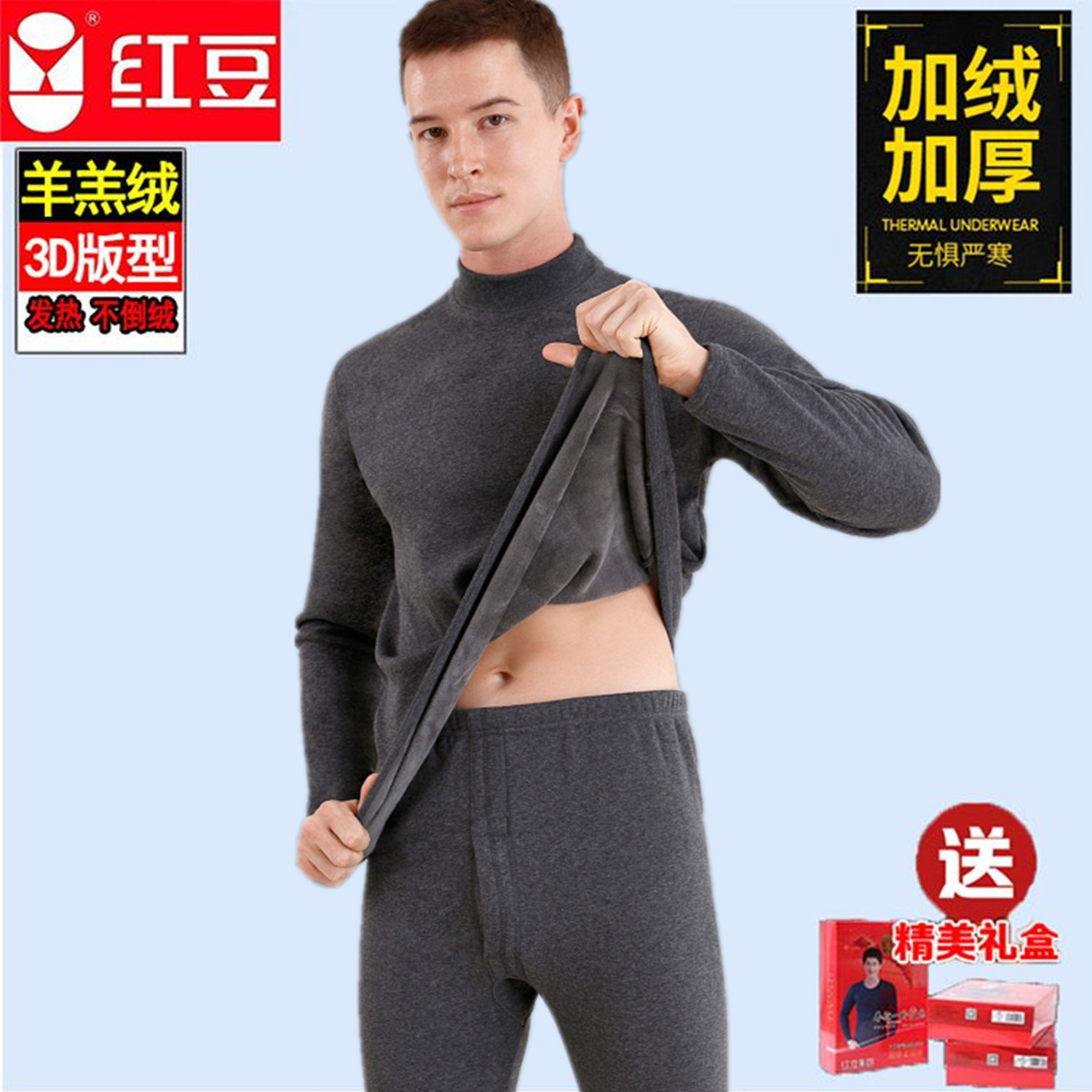 红豆保暖内衣男士加厚加绒中老年人青年高领防寒秋衣秋裤套装冬季