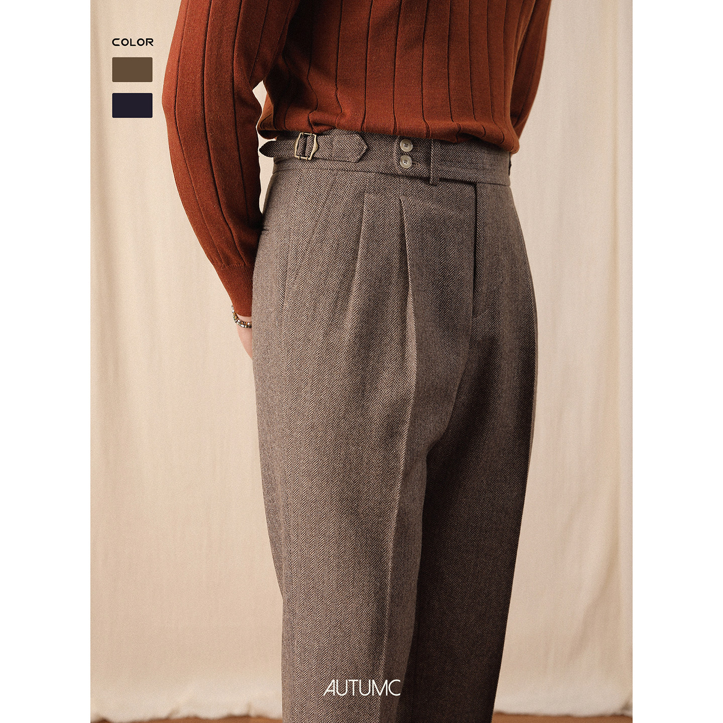 羊毛粗花呢西裤男冬季直筒巴黎扣休闲裤意式垂感免烫人字纹高腰裤