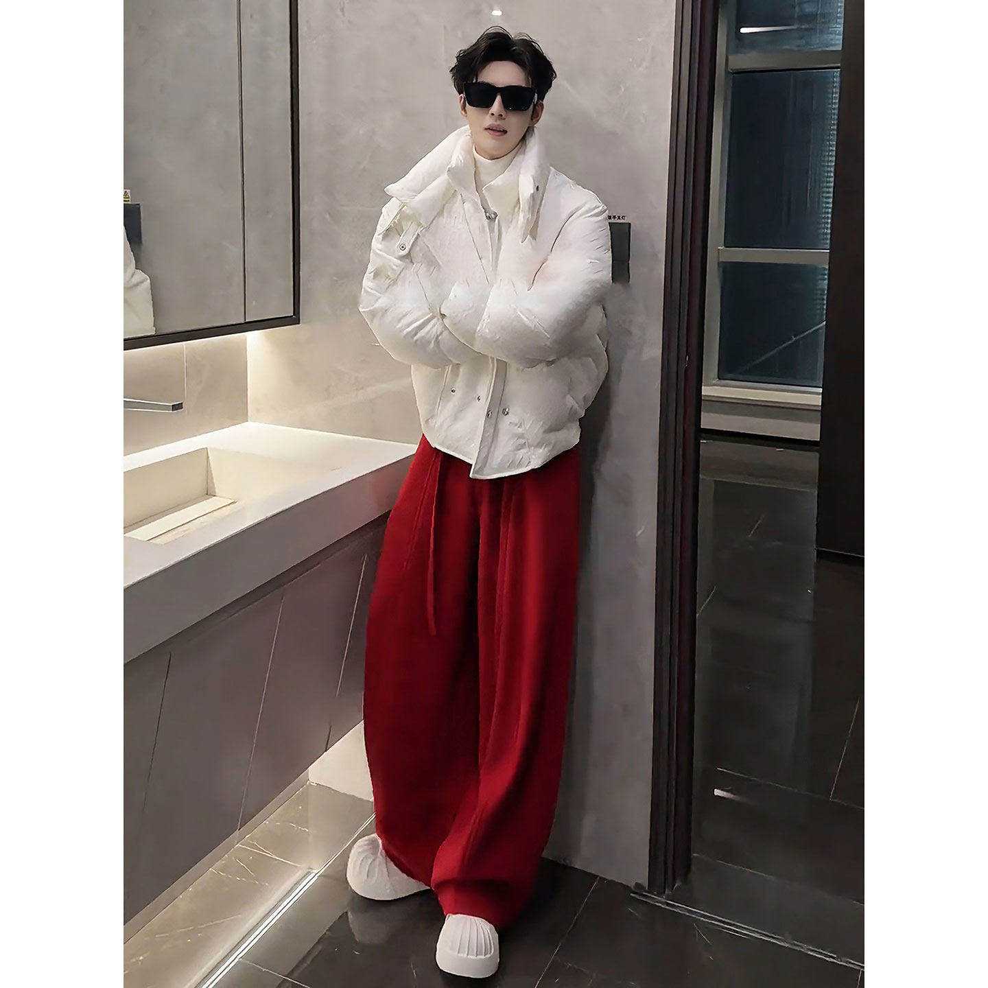 本命年红色弯刀微喇西裤男冬季美式痞帅高级感裤子直筒抽绳阔腿裤
