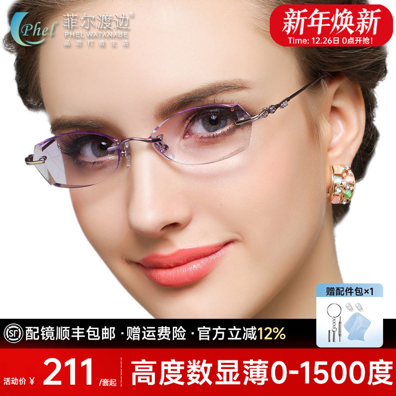 高度超薄无框近视眼镜架女士变色 钻石切边眼镜 配眼镜近视女T217