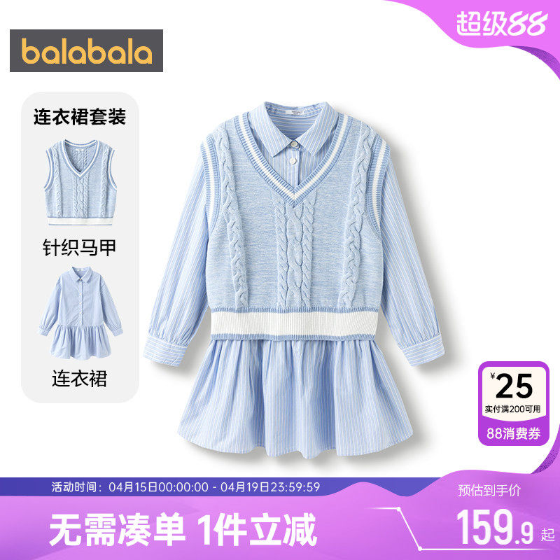 巴拉巴拉女童连衣裙套装中大童纯棉针织衫马甲裙子儿童洋气春秋款