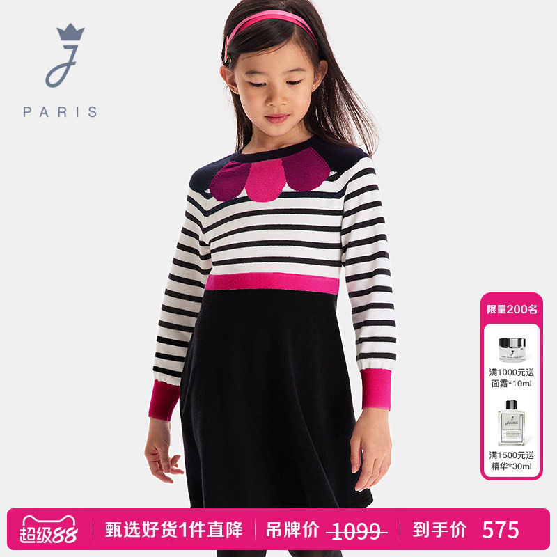Jacadi亚卡迪法国女童羊毛混纺针织连衣裙春秋款条纹长裙2039596